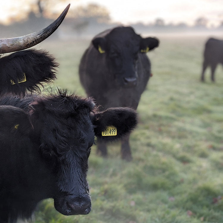 At Somerleyton we are fortunate our 'Wildstock' can graze on the Waveney river valley marshes all summer long. We have reduced the stocking density and grazing patterns to create a more varied mosaic grassland more suitable for ground nesting birds and we work we purposely keep them much wetter throughout the winter for until June for the same reason. For this regenerative farming system we have polled welsh black cattle and black welsh mountain sheep sometimes crossed with south down which produce an unrivalled taste.